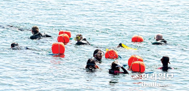 6일 제주시 한림읍 한수풀해녀학교에서 관광객들이 제주에서만 즐길수 있는 해녀체험을 하고 있다. 강희만기자