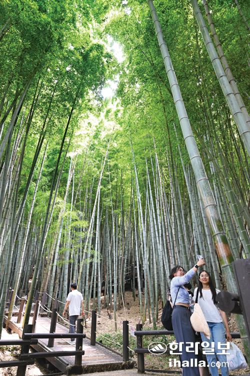 장맛비가 잠시 그쳐 30℃를 크게 웃돌며 폭염주의보가 내려진 10일 제주시 한라수목원을 찾은 관광객들이 대나무 숲에서 사진을 찍고 있다. 이상국기자