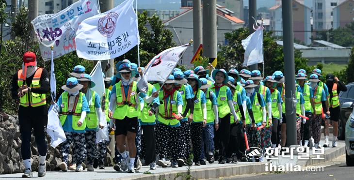 11일 제주시 삼양동 해안도로에 국토순례에 나선 다른지역 대학생들이 무더운 날씨 속에 걸어가고 있다. 강희만기자