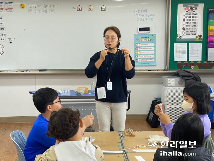 그에게 기회가 찾아왔다. 아시아기후변화교육센터에서 '기후변화 전문강사 양성과정'을 진행한다는 소식이 들려온 것이다. 그는 환경에 대해 자세히 들을 수 있다는 생각에 참여하게 됐고, 과정을 수료한 후 지난 2020년부터 도내 학교 등에서 바다 환경과 업사이클링 교육을 하고 있다. "바닷가에 버려진 해양쓰레기를 주워와 깨끗이 씻고 말린 후 손질해, 책갈피나 볼펜 등을 만드는 키트를 만들어 환경 교육에 이용하고 있어요. 만들기로 끝나지 않고 아이들에게 의미를 전달하려고 해요. 소품을 하나 만드는 데 사용된 플라스틱과 폐그물의 양은 제주 바닷가를 약 1㎡를 청소한 것과 같다고 얘기해주면서 의미를 전하고 있어요."