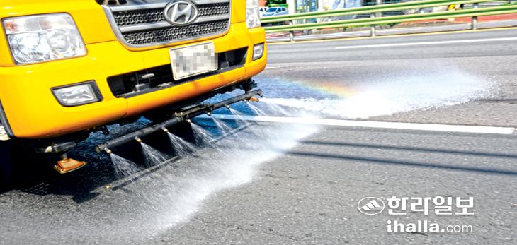 폭염경보가 내려진 11일 제주시청 살수차가 뜨겁게 달궈진 시내 도로에 물을 뿌리며 열을 식히고 있다. 강희만기자