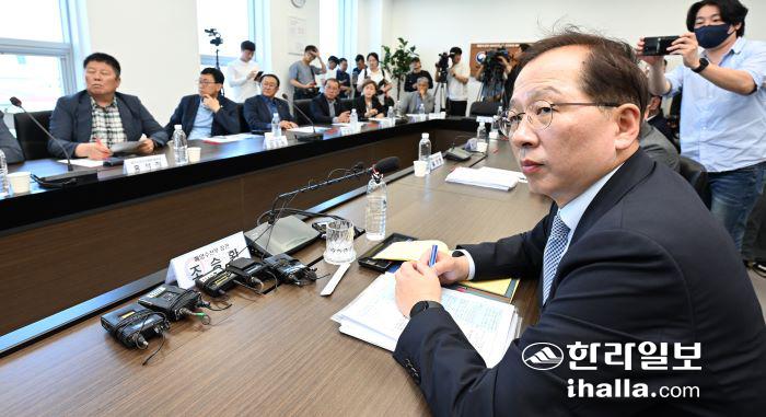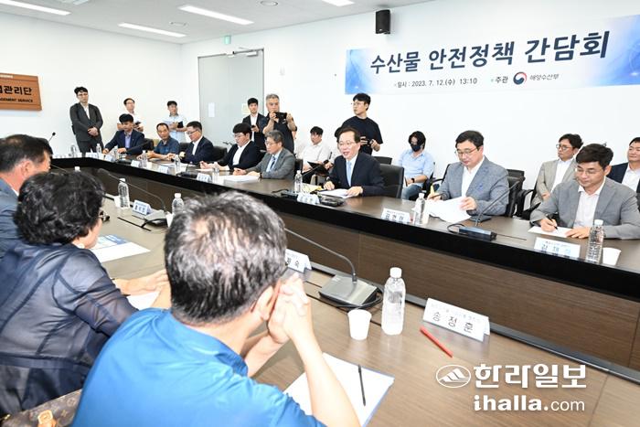 조승환 해양수산부 장관은 12일 제주시 건입동 남해어업관리단을 찾아 도내 어업인들과 수산물 안전정책 간담회를 가졌다. 이상국기자