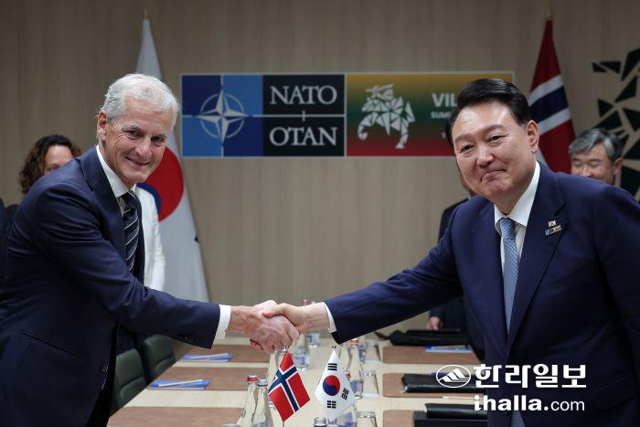 북대서양조약기구(NATO·나토) 정상회의에 참석하는 윤석열 대통령이 11일 빌뉴스 나토 정상회의장에서 가진 요나스 가르 스퇴레 노르웨이 총리와의 정상 회담에서 악수하고 있다. 연합뉴스