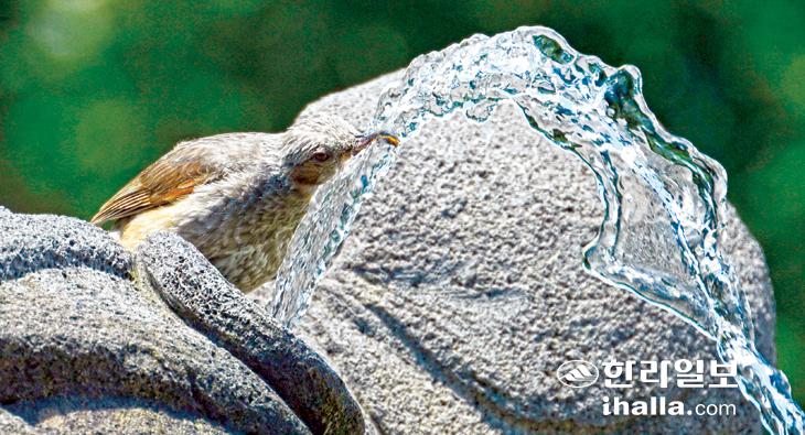[한라일보] 연일 폭염이 기승을 부리고 있는 가운데 12일 제주도민속자연사박물관 물허벅여인상에 더위 먹은 직박구리가 앉아 떨어지는 물줄기로 목을 축이고 있다. 강희만기자