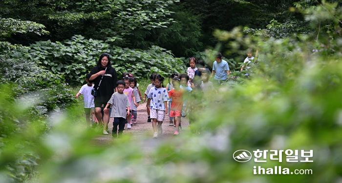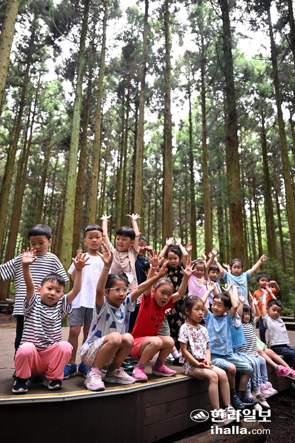 [한라일보] '제15회 사려니숲 에코힐링 체험'을 하루 앞둔 13일 오전 제주시 봉개동 소재 선도어린이집 원아들이 사려니숲을 찾아 즐거운 시간을 보내고 있다. 사려니숲 에코힐링 체험 행사기간 자연휴식년제가 적용된 물찻오름을 비롯해 사려니오름이 한시적으로 개방되며 기존 프로그램과 곁들여 '사려니(한라산둘레길) 숲 아카데미'를 처음으로 선보인다. 강희만기자