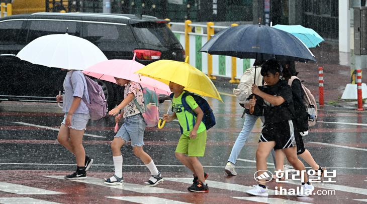 비가 내린 17일 제주시 아라초등학교 어린이들이 우산을 쓴 채 빠른 걸음으로 이동하고 있다. 강희만기자