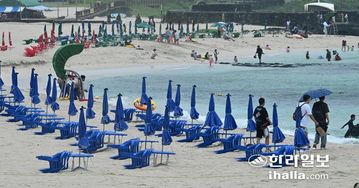 장맛비가 오락가락한 19일 제주시 애월읍 곽지해수욕장을 찾은 관광객들이 한산한 해변에서 바다를 구경하고 있다. 강희만기자