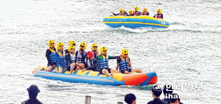 18일 제주시 함덕해수욕장에서 관광객들이 바나나보트를 타며 제주바다를 만끽하고 있다. 이상국기자