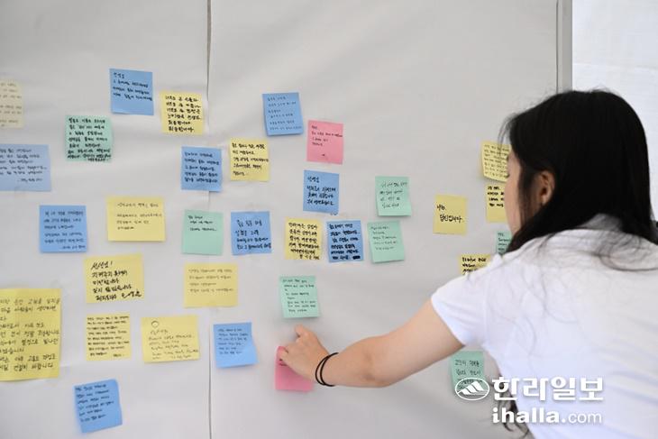 22일 제주도교육청 앞마당에 마련된 서울 모 초등학교 교사 추모 공간. 고인을 애도하는 문구를 담은 메모지들이 추모 공간 한편을 채우고 있었다. "얼굴도 이름도 모르지만 같은 '교사'이기 때문에 그 힘듦을 공감한다"는 또 다른 메모는 수많은 교사들이 현재 교단에서 마주하는 현실을 보여주는 듯 했다.