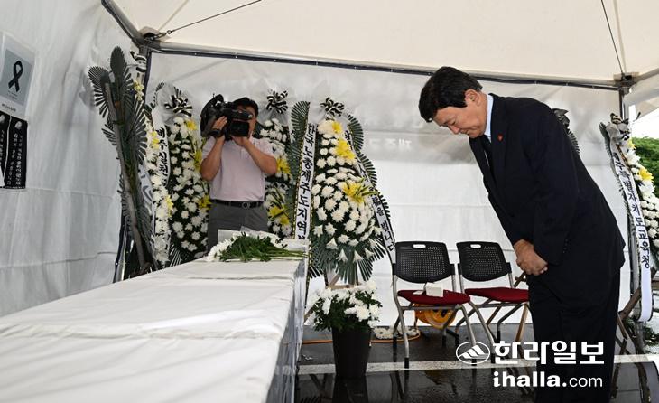 제주도교육청 앞마당에 마련된 서울 모 초등학교 교사 추모 공간을 찾는 도민들의 발길이 이어지고 있다. 이상국기자