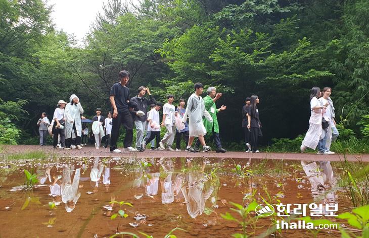 지난 22일 사려니 숲 아카데미에 참가한 무름중학교 학생들이 사려니숲길을 걷고 있다. 사진=산림문화체험 사려니숲길위원회