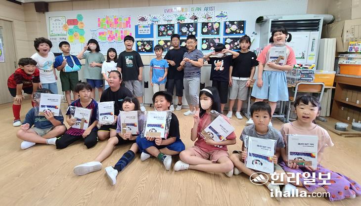 하도초 4학년 학생들이 직접 만든 그림책을 들고 기념촬영을 했다. 하도초 제공