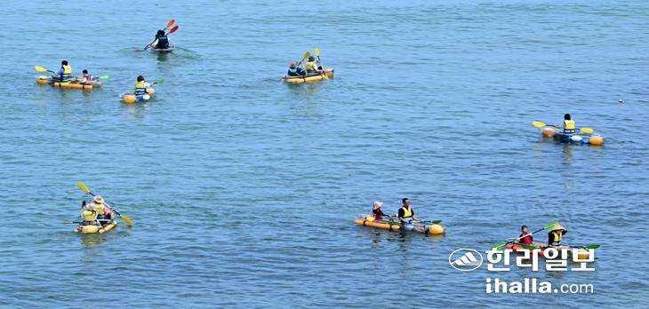 27일 제주시 애월읍 한담 해변을 찾은 관광객들이 투명카약을 타고 제주의 푸른 바다에서 즐거운 시간을 보내고 있다. 강희만기자