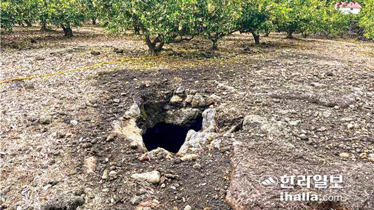 한남리 '기성공업사' 인근 한 과수원에 있는 숨골. 용암동굴 천장이 무너지면서 생긴 숨골이다.