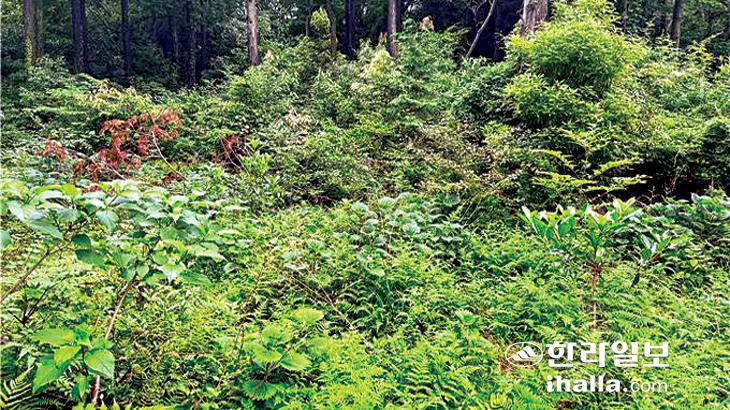 수망리 ‘민오름’ 인근 임야에는 편백나무와 삼나무로 둘러싸인 숨골이 있다. 주변으로 덩굴·양치식물들이 우거져 있다. 숨골이 주변보다 낮은 지역에 있어 강우시 빗물이 유입될 것으로 예상됐다.