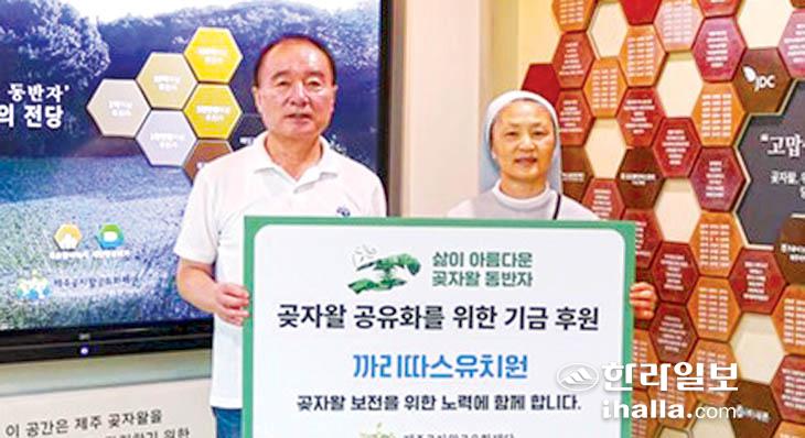 제주시 아라동 소재 까리따스유치원(원장 박순미 펠리노 수녀)은 지난 27일 제주곶자왈공유화재단(이사장 김범훈)을 방문, 곶자왈 보전 기금 131만7400원을 전달했다.