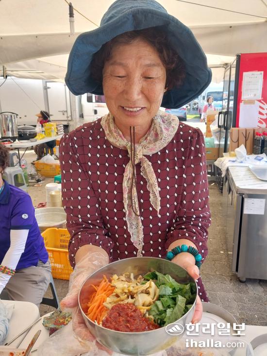 제주 금능바다에서 물질하는 해녀 고덕심 씨가 뿔소라를 넣은 비빔밥을 만들어 보여주고 있다. 김지은기자
