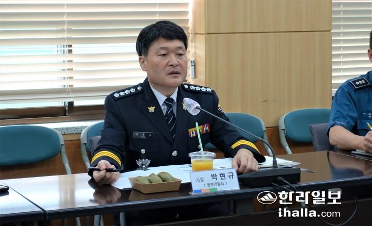 박현규 제주동부경찰서장이 1일 기자간담회를 갖고 질의에 답변하고 있다.