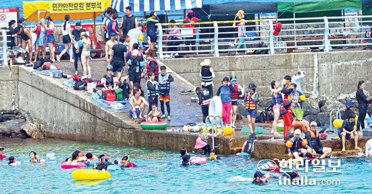 연일 불볕더위가 기승을 부린 1일 제주시 한경면 판포리 포구를 찾은 관광객들이 물놀이를 즐기고 있다. 강희만기자