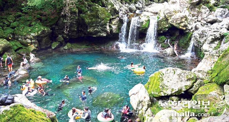 [한라일보] 폭염이 기승을 부린 3일 서귀포시 돈내코 원앙폭포에 많은 피서객들이 찾아 물놀이를 즐기고 있다. 이상국기자