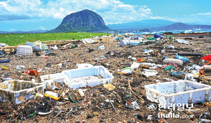 지난 5일 서귀포시 안덕면 사계리 해안에 수많은 해양쓰레기가 쌓여 청정제주의 미관을 해치고 있다. 강희만기자