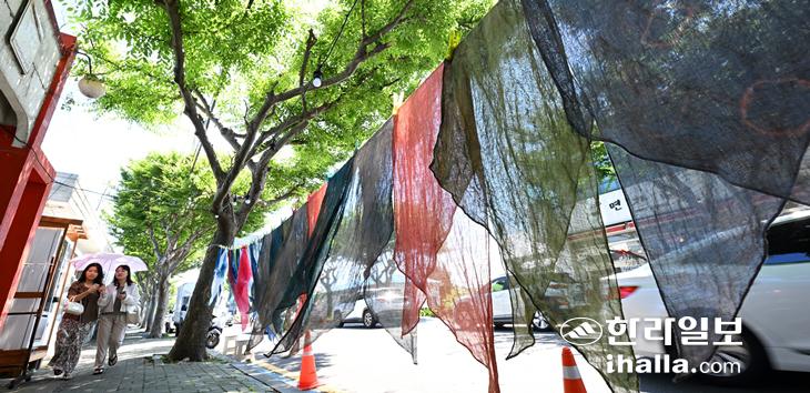 [한라일보] 6일 제주시 한림읍 협재리 한 인도에 형형색색의 아름다운 천연염색 천이 널려있다. 이상국기자