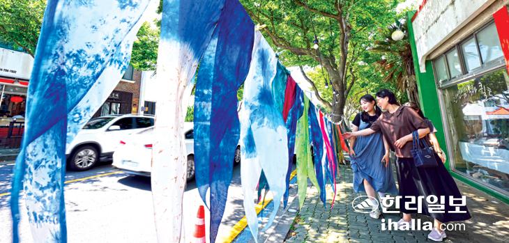 [한라일보] 6일 제주시 한림읍 협재리 한 인도에 형형색색의 아름다운 천연염색 천이 널려있다. 이상국기자