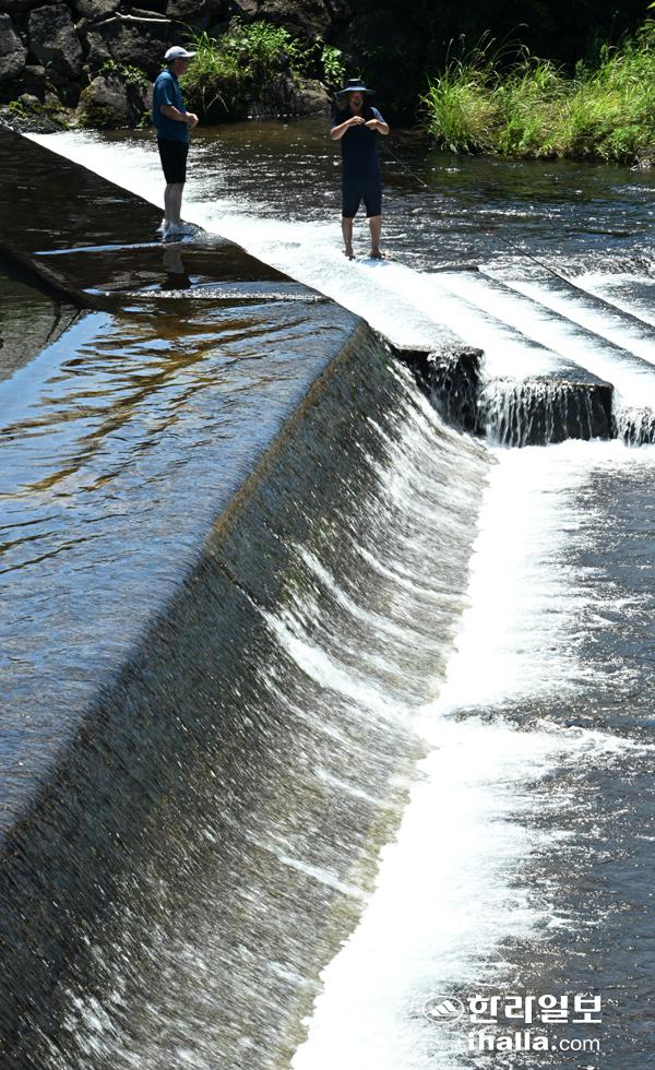 폭염날씨가 이어진 8일 서귀포시 강정동 악근천을 찾은 강태공들이 시원한 하천에 발을 담근 채 낚시를 즐기고 있다. 강희만기자