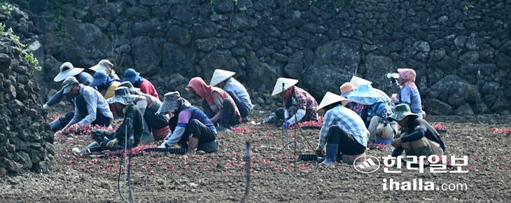 13일 제주시 애월읍 곽지리 한 농경지에서 농민들이 무더운 날씨 속에 적양배추 모종 파종 작업을 하고 있다. 강희만기자