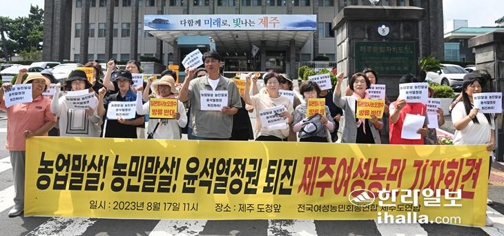 17일 제주도청 앞에서 국여성농민회총연합 제주도연합이 \\\'농업말살! 농민말살! 윤석열 정권 퇴진\\\' 기자회견을 열고 있다. 이상국기자