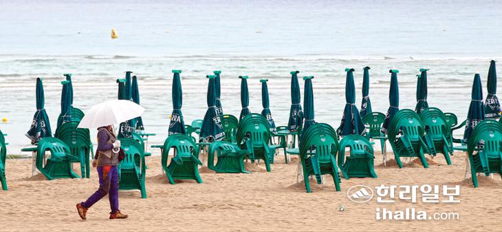 22일 제주시 함덕해수욕장에 비가 내리는 가운데 해수욕장을 찾은 관광객들이 우산을 쓴채 해변을 산책하고 있다. 이상국기자