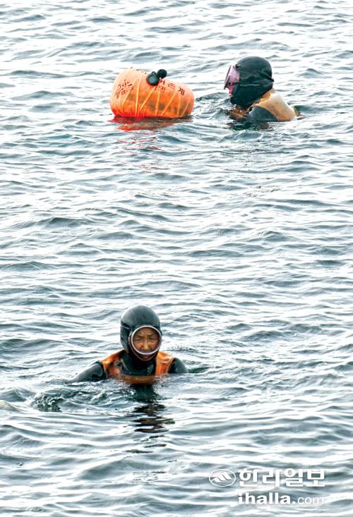 23일 제주시 용담동 해안에서 해녀들이 물질을 하고 있다. 강희만기자