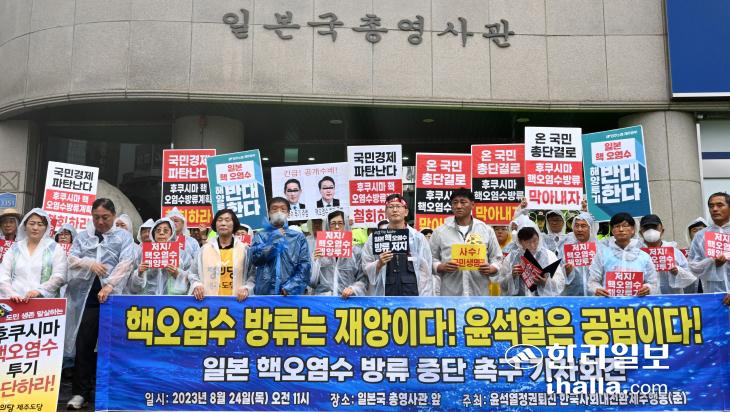 노동당·더불어민주당·민생당·정의당·진보당 제주도당, 제주녹색당 등 제주도 야6당 관계자들이 24일 제주시 노형동 일본총영사관 앞에서 기자회견을 열고 일본의 핵오염수 방류를 규탄하는 퍼포먼스를 진행하고 있다. 이상국기자