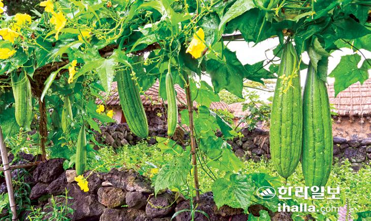 늦더위가 기승이다. 한낮은 무더워도 아침저녁 바람결엔 어느새 선선한 기운이 느껴진다. 29일 서귀포시 표선면 성읍민속마을 초가집 마당에 수세미가 알차게 열매를 맺어 계절의 변화를 보여주고 있다. 강희만기자