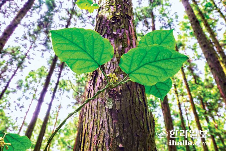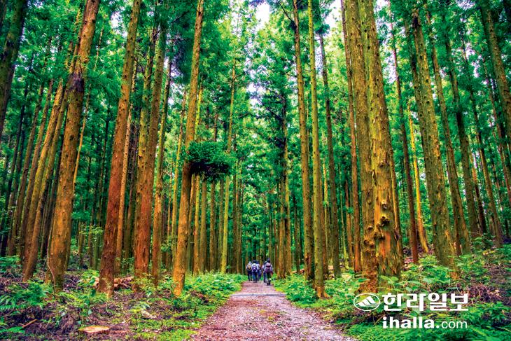 시험림길은 연구를 목적으로 운영 중인 한남시험림 내 삼나무림 등을 지나는 한라산 둘레길이다. 삼나무가 겹겹이 자라는 시험림길을 잠시 지난 뒤 방향을 틀어 남원쓰레기처리장을 향하는 삼나무숲길로 들어섰다. 삼나무를 감고 올라가는 나도은조롱 하얀 꽃의 인사를 뒤로하며 일행은 걸음을 재촉한다.