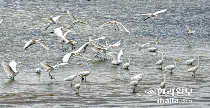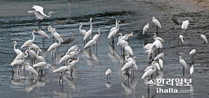 [한라일보] 월동지로 가던 중대백로들이 31일 제주시 구좌읍 종달리 해안에서 잠시 휴식을 하고 있다. 강희만기자