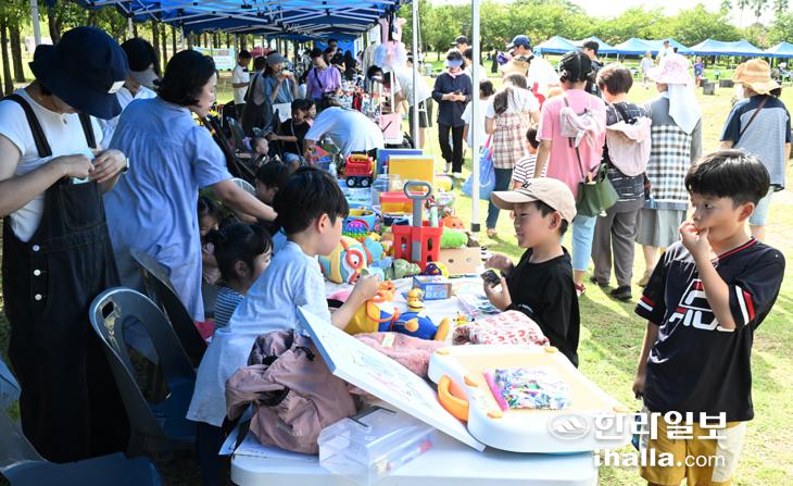 지난 2일 제주시민복지타운 광장 일원에서 열린 '제주시 재활용 나눔 축제' 프로그램 중 하나인 '어린이 벼룩시장'을 찾은 아이들이 집에서 안 쓰는 물건을 가져와서 사고파는 활동을 하고 있다. 강희만기자