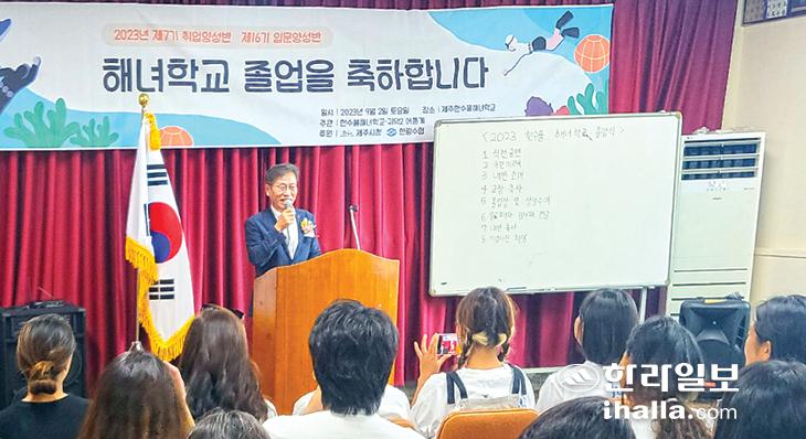 제주시 한수풀 해녀학교 졸업식이 지난 2일 한림읍 한수풀 해녀학교 광장에서 열려 총 54명의 졸업생(입문반 41명, 직업양성반 13명)을 배출했다. 이날 졸업식에 참석한 안우진 부시장은 "한수풀 해녀학교를 통해 제주 바다의 중요성과 해녀 문화 계승의 공감대가 널리 전해지길 바란다"며 졸업생들에게 축하와 격려를 보냈다.