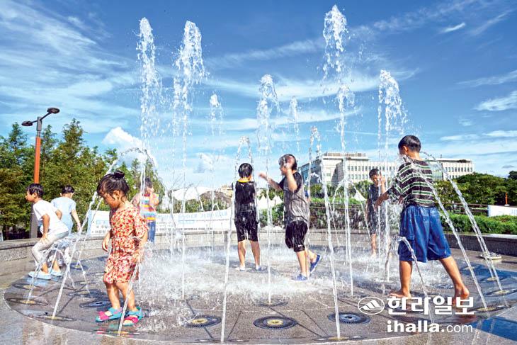 늦더위가 기승을 부린 지난 2일 제주시 제주시민복지광장 분수대에서 어린이들이 시원하게 뿜는 물줄기를 맞으며 즐거워하고 있다. 강희만기자