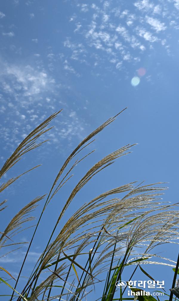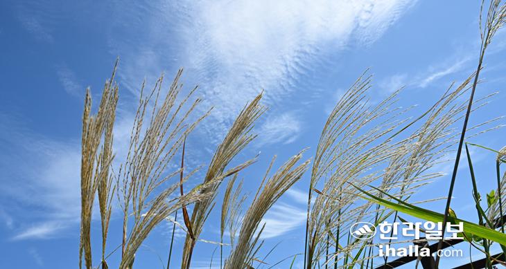 [한라일보] 늦더위가 기승을 부린 5일 서귀포시 성산일출봉 진입로 도로변에 억새가 피어 시나브로 다가온 가을을 실감하게 한다. 강희만기자
