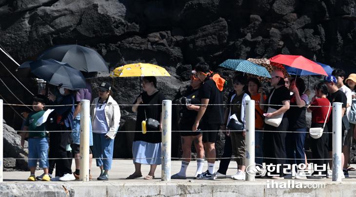 9일 국토 최남단 마라도를 찾은 관광객들이 양산을 쓰고 여객선을 기다리고 있다. 강희만기자