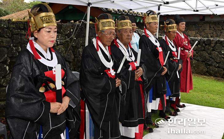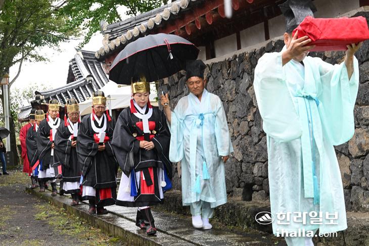16일 오전 정의향교에서 초헌관을 맡은 김미자 서귀포수협 조합장 등 헌관들이 석전대제 봉행을 위해 대성전으로 향하고 있다. 이상국기자