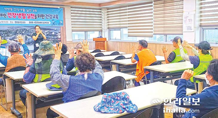 서귀포시 정방동(동장 현정준)과 정방동 시민건강생활 민간추진단(단장 김민아)은 지난 14일 동주민센터 회의실에서 관내 일자리 사업 공공근로자와 주민 20여 명을 대상으로 건강 생활 실천을 위한 건강 교육을 실시했다. 이날 교육에서는 일상 생활에서 가벼운 운동의 중요성에 대해 교육하고 틈틈이 할 수 있는 건강 체조를 배우는 시간을 가졌다.
