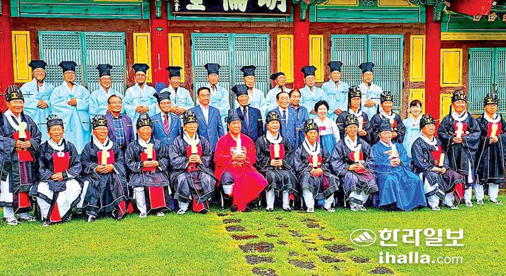 제주향교(전교 진인수)는 지난 16일 제주향교 계성사와 대성전에 성현선인들께 추기석전 분향례를 봉행했다. 대성전은 공부자를 비롯해 대설위 향교이기 때문에 39위를 모시고 있으며 계성사는 오성인의 선친을 모시고 있다. 이날 송재호 국회의원 비롯해 세계자연유산본부 김희찬 본부장이 참석해 김경남 향교 총무수석에게 공로 표창장을 수여했다.