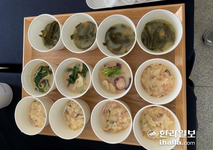 제주어촌특화지원센터 코너에 성게 미역국, 뿔소라 크림 리조또 등이 시식용으로 준비돼 있다. 사진=제주어촌특화지원센터