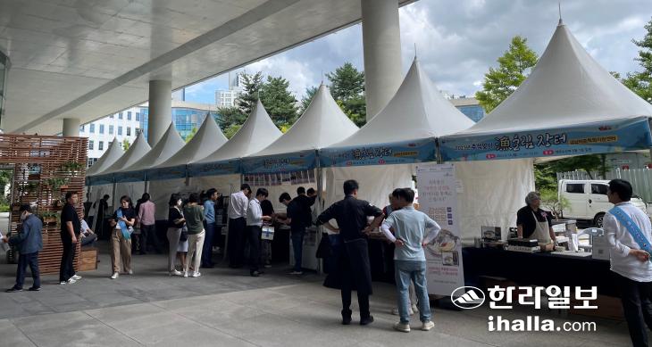 18일 세종시 정부세종청사에서 열린 '2023년 추석 어(漁)울림 장터'에서 제주 어촌특화 상품 홍보·판매가 진행되고 있다. 사진=제주어촌특화지원센터