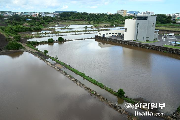 17일 오후 늦게부터 서귀포시 성산읍 지역에 시간당 최대 74.7㎜의 기습 폭우가 쏟아지면서 18일 지역의 월동채소류 파종 농경지가 물에 잠겨 있다. 강희만기자