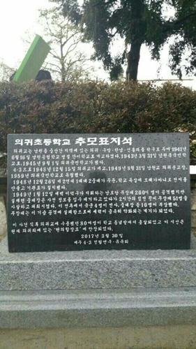 4·3당시 군대가 주둔한 서귀포시 남원읍 의귀초등학교의 교문 앞에 지난 2016년 설치된 표지석.