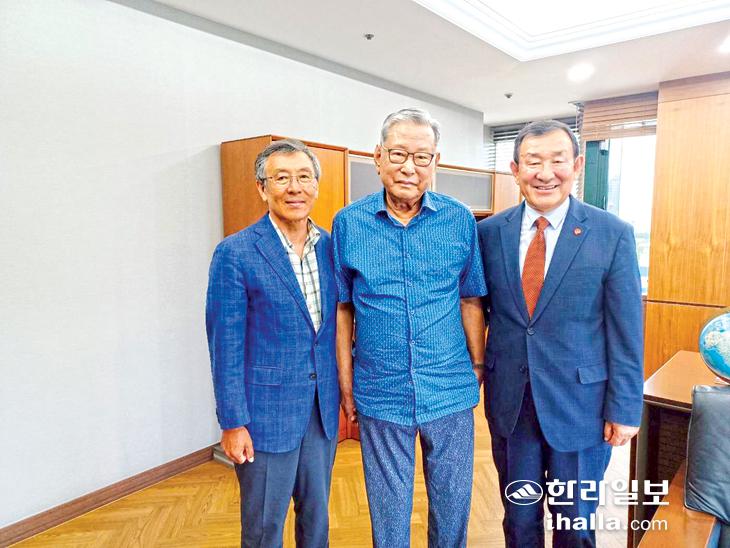 기념촬영을 하고 있는 김종인 (주)서일 회장(사진 가운데)과 강기주 오현고등학교 총동창회 강기주 회장(오른쪽)·오용덕 부회장(왼쪽).