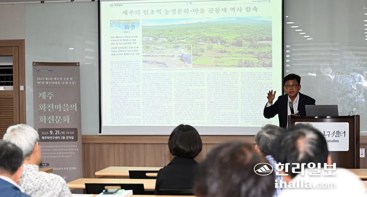 진관훈 제주테크노파크 수석연구원은 21일 제주학연구센터에서 열린 '2023 제4회 제주학 주간 및 제7회 제주학대회' 초청 특강에 나서 '제주 화전마을의 화전문화'의 주제 발표를 통해 "제주화전은 도민 정체성과 근현대사의 주요 골격"이라고 강조했다.